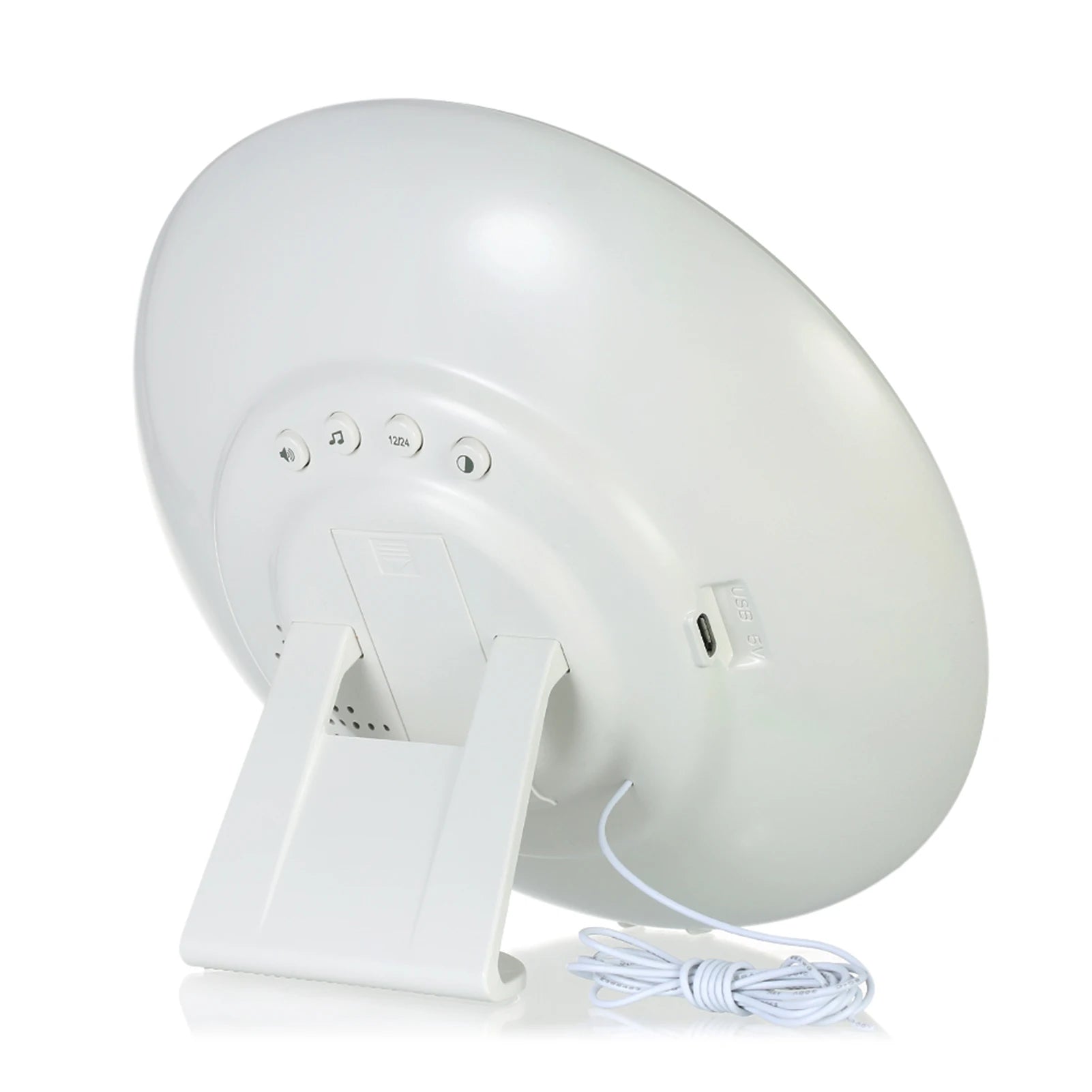 Transformez vos matins avec ce radio réveil lumineux LED simulateur d’aube. Sa lumière imite le lever du soleil, augmentant progressivement en intensité pour vous aider à vous réveiller naturellement. Vous pouvez choisir parmi 6 sons apaisants (oiseaux, vagues, etc.) ou opter pour votre station FM préférée. En soirée, son mode coucher de soleil tamise la lumière pour favoriser l’endormissement. La veilleuse multicolore propose 6 teintes et 10 niveaux de luminosité pour créer l’ambiance idéale. Compact et moderne, ce réveil est équipé de touches tactiles sensibles, d’une fonction snooze et d’un affichage digital clair. Un compagnon bien-être indispensable pour des nuits paisibles et des réveils revitalisants.
