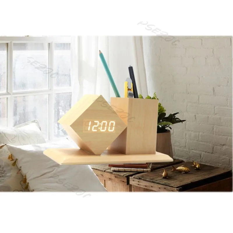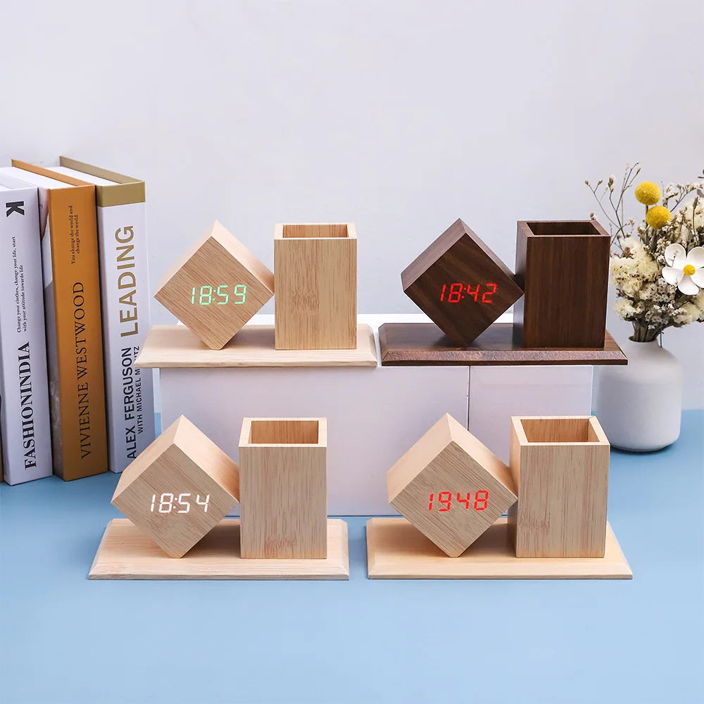 Réveil Bois Cube avec Porte-Stylo – Design Naturel et Épuré