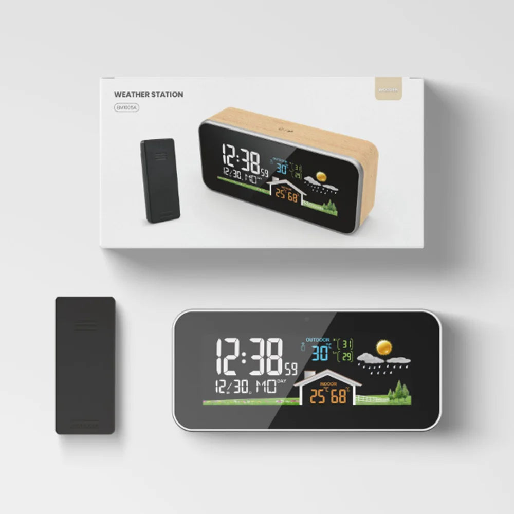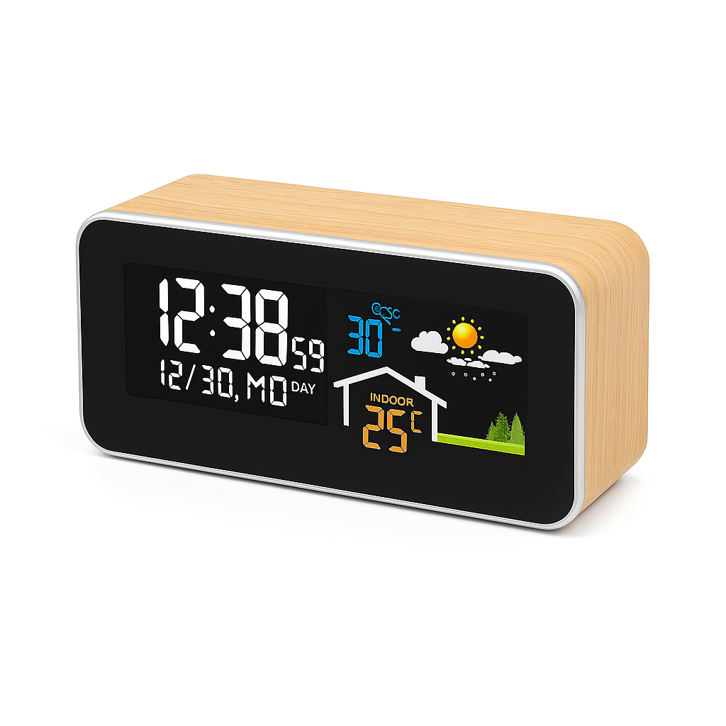 Réveil Bois avec Météo, Température Intérieure/Extérieure et Écran Couleur