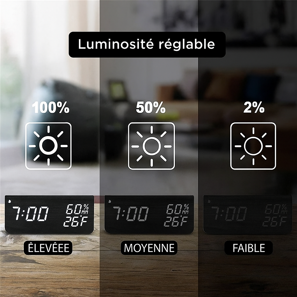 Le réglage de la luminosité en 3 niveaux vous permet de l’adapter selon votre environnement – idéal pour les nuits sombres ou les réveils tout en douceur.