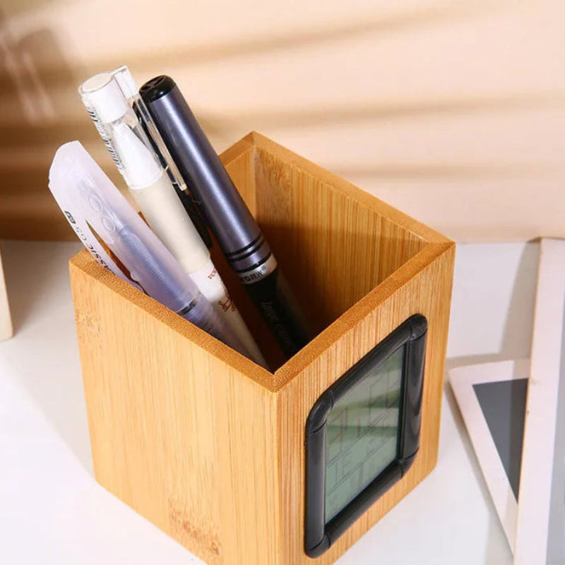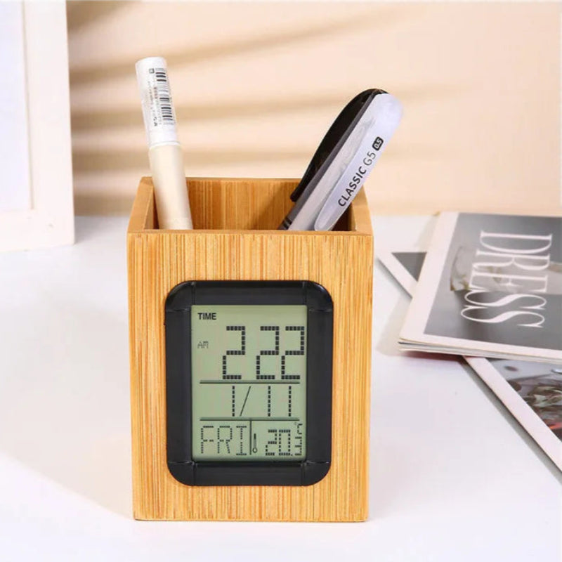 Réveil Digital en Bois avec Pot à Stylos Intégré – Organiseur de Bureau Élégant