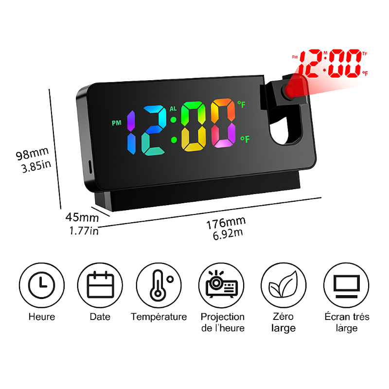 Modernisez vos réveils avec ce réveil projecteur LED multicolore. Son écran large à affichage arc-en-ciel affiche heure, date et température avec clarté. Sa fonction de projection rouge permet de consulter l’heure au plafond ou sur un mur, même la nuit sans effort.